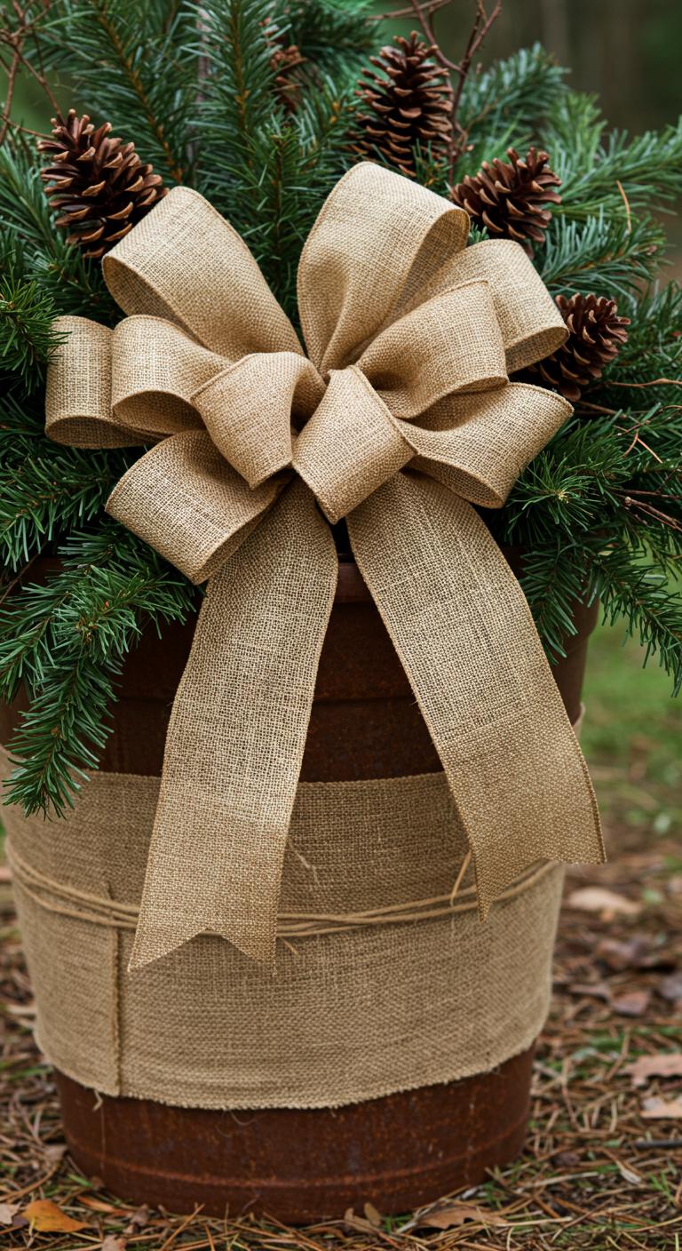 If you want a quick, rustic upgrade to your outdoor planters, wrap them in burlap ribbon for instant texture and holiday charm.