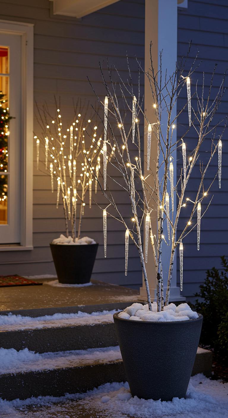 Try using a few bare branches from the yard, some white string lights, and a sturdy pot to create simple lighted icicle branches that give your porch or pathway a frosty, festive glow.