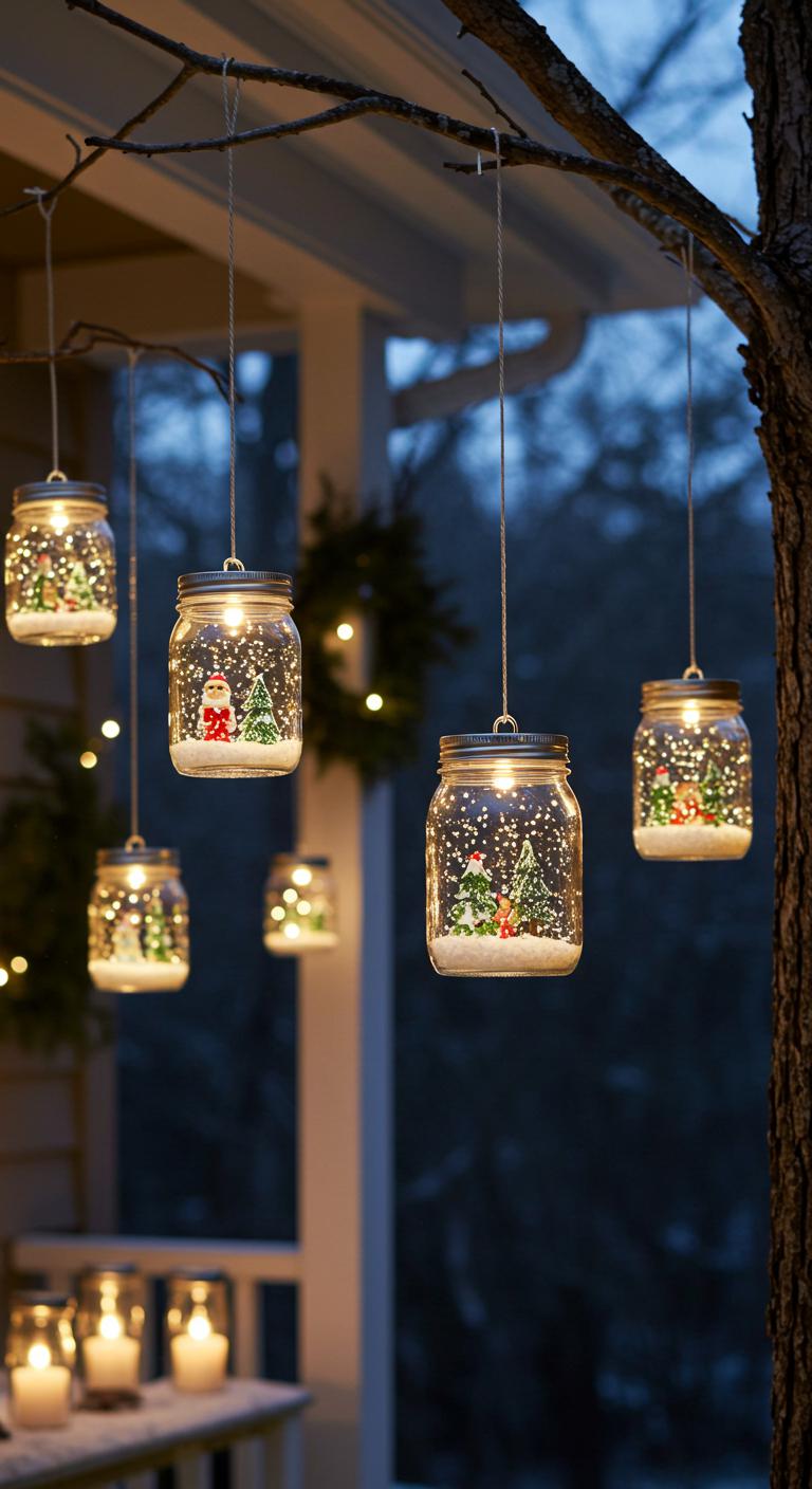 When you hang mason jar snow globes from a porch beam or tree limb, they turn ordinary outdoor spaces into twinkling pockets of winter magic; you’ll use simple materials—jars, faux snow, mini figurines, and battery-powered tea lights—to build weatherproof, eye-catching ornaments that sway gently in the breeze.