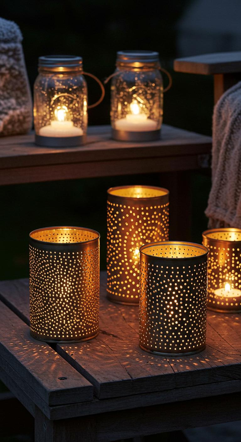 You’ll punch holes into cans for tin can designs, paint or tape patterns, and perch candles or LEDs inside.
