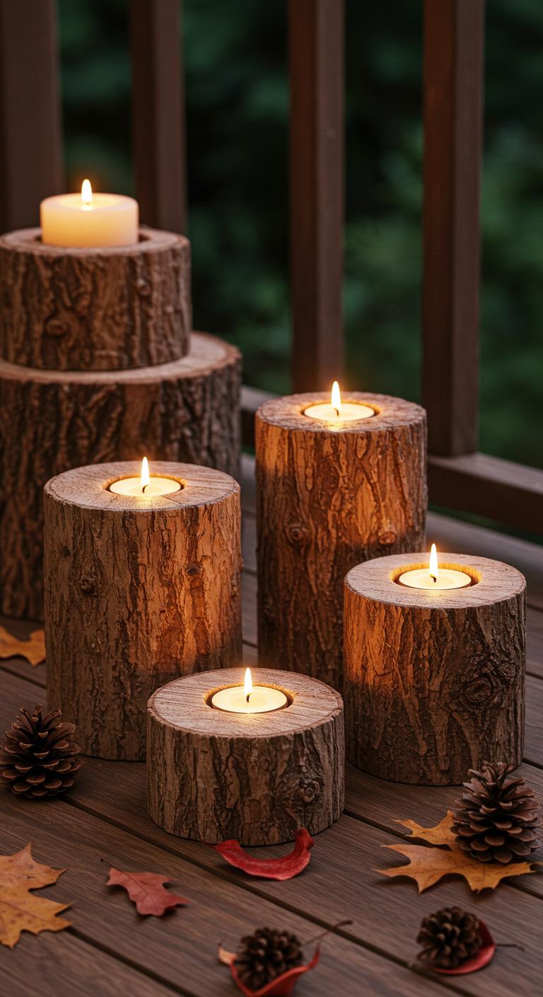 Choose varied diameters, drill snug cavities for a log candle or tealight, seal rough edges, and arrange freely for bold rustic decor.