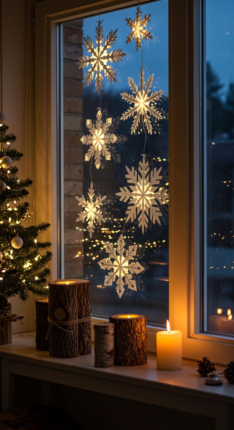 After you’ve set out those log candle holders, brighten up nearby windows with snowflake cutouts that glow from within.