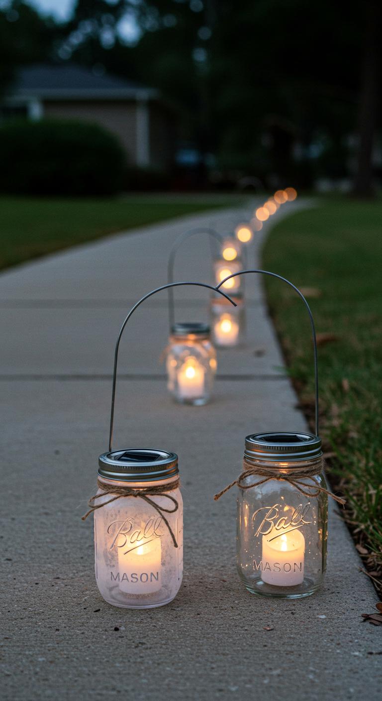Create a simple, charming walkway by turning mason jars into lanterns you can line along the path—no fancy tools required. You’ll pick mason jar themes, add battery tea lights or solar candles, and hang or stake jars for steady lantern lighting. Paint, twine, or frosted spray give personality. Place jars evenly for safe, inviting guidance that feels homemade and liberating.