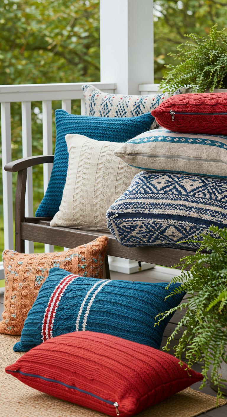 You’ll cut cozy sleeves, stitch seams, and mix sweater patterns for bold, free-spirited flair. Use weatherproof inserts or removable liners to protect cushions, and secure covers with zippers or buttons so you can refresh looks, keep outdoor comfort, and enjoy DIY freedom.