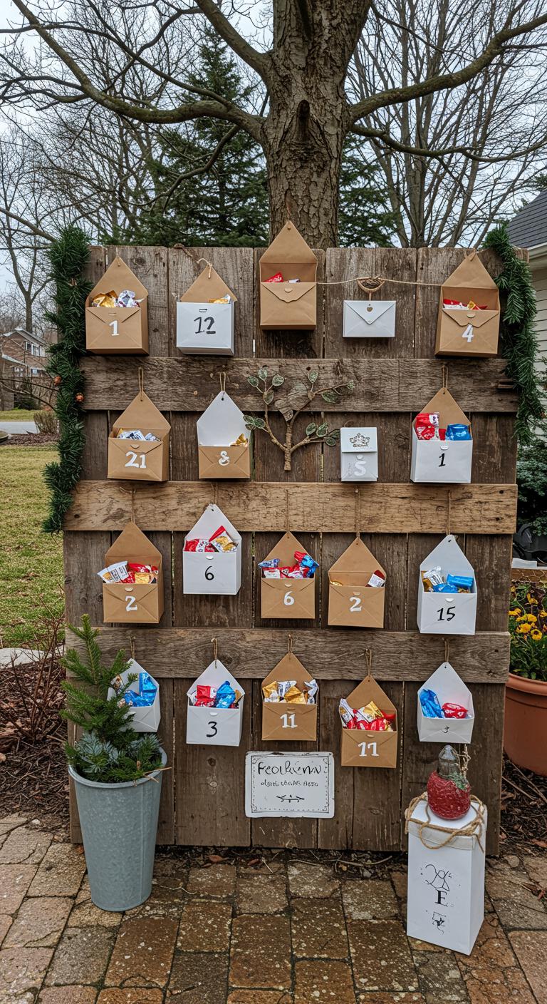 Want a festive focal point that counts down to Christmas and invites neighborhood smiles? You can build an outdoor calendar from reclaimed wood, small boxes or hanging envelopes, then paint bold numbers and swap tiny treats daily. Mix advent themes—nature, lights, or kindness challenges—to reflect your style. It’s sturdy, weather-aware, and lets you celebrate openly while encouraging neighbors to peek and participate.