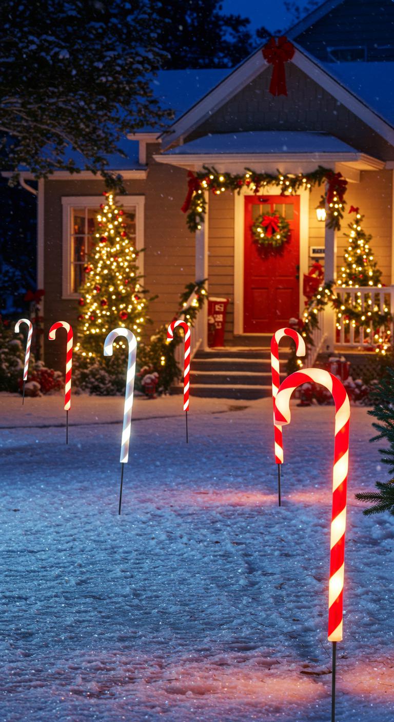 Anyone can brighten a walkway quickly with lighted candy cane stakes that guide guests and add instant holiday charm.