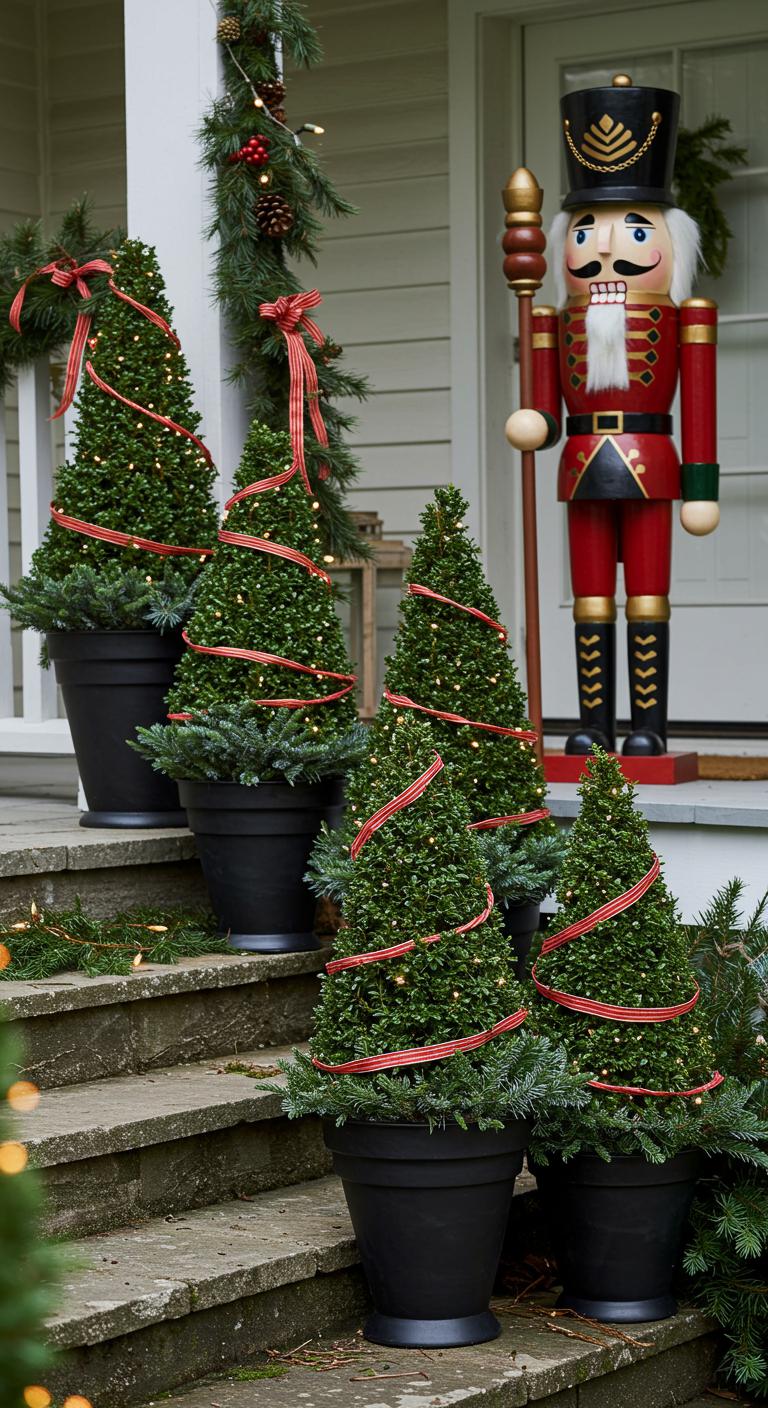 If you’ve just finished a wooden nutcracker, pick up some evergreen topiary cones to frame your steps and balance that taller focal point.