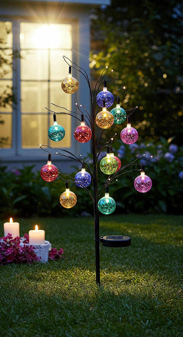 You’ll assemble a simple frame, hang shatterproof baubles and string solar lights, enjoying solar energy benefits while keeping maintenance low.