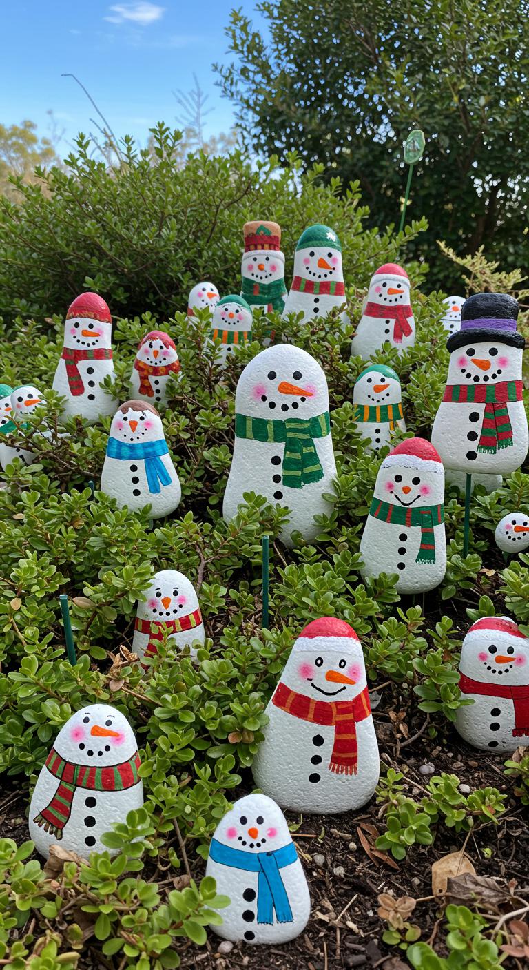 You can keep the same DIY spirit from the solar ornament tree and bring that cheerful glow down to the garden beds with painted rock snowmen.