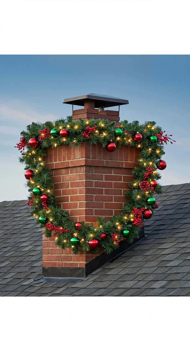 Give your chimney a festive crown with a festooned topper that’s lightweight, weatherproof, and easy to attach — think a framed garland of faux greenery, battery-powered lights, and a few waterproof ornaments that won’t damage your roof.