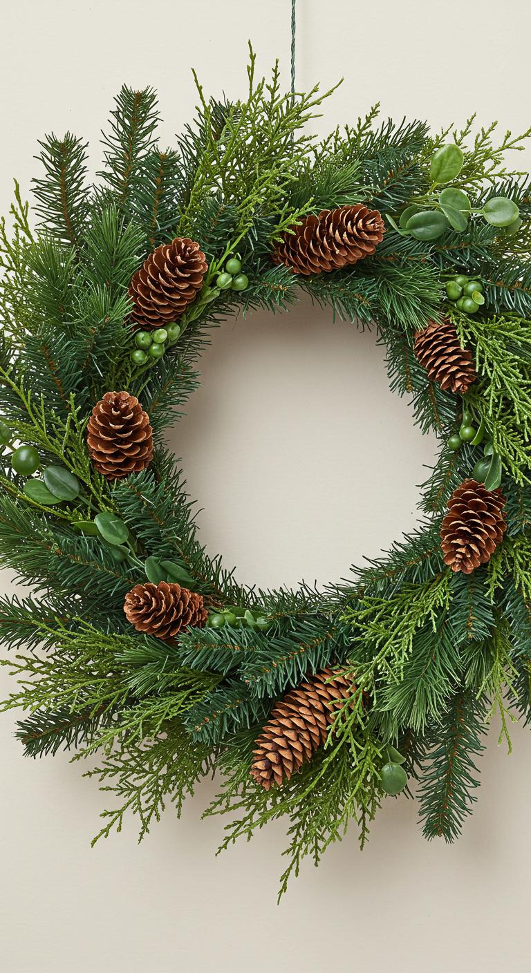 Start by gathering a sturdy wreath form, fresh or faux evergreen sprigs, and a handful of pinecones so you’ve got everything within reach; you’ll attach the greens in overlapping bundles, tuck pinecones into the branches, and secure with floral wire for a classic, durable look.