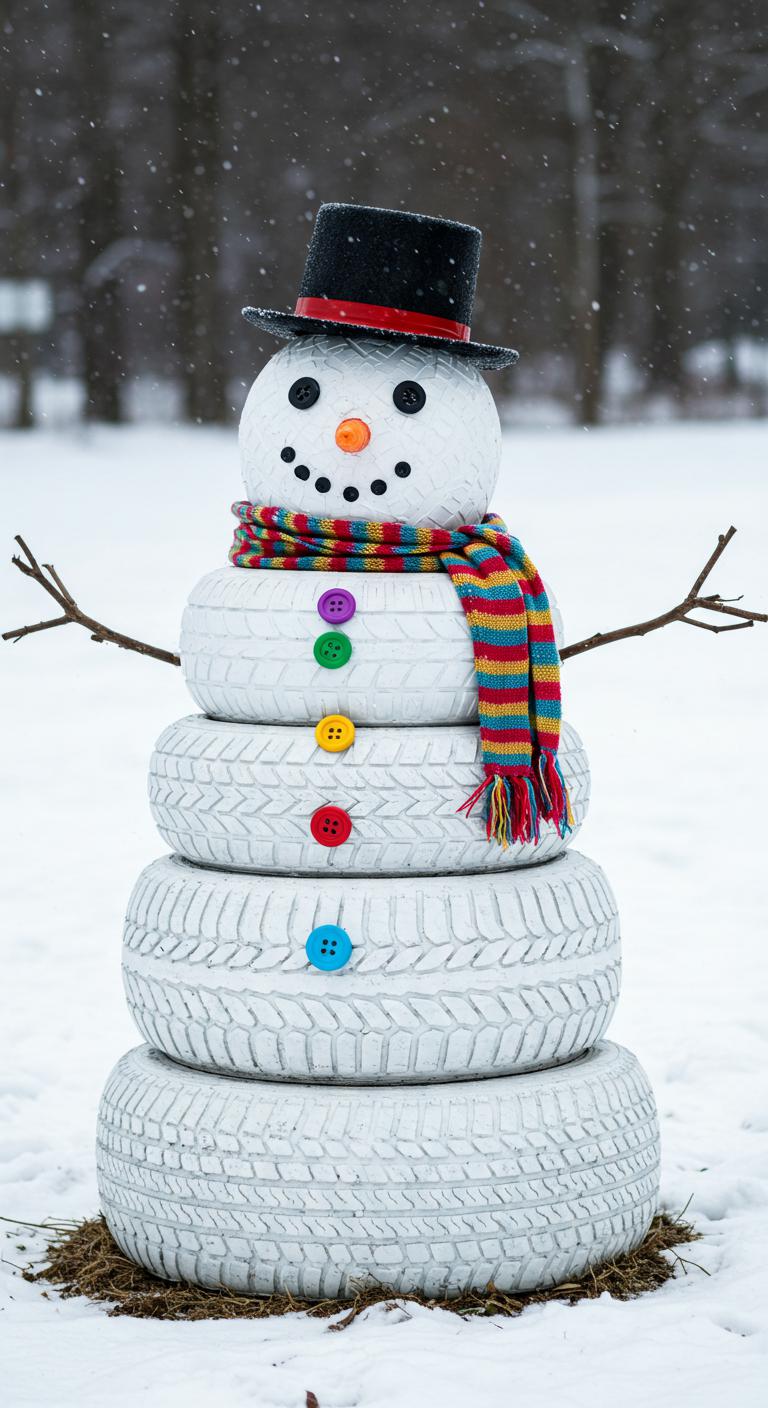 Grab a few old tires, some white spray paint, and a handful of simple accessories, and you can turn roadside castoffs into a charming snowman stack that’s sturdy, weatherproof, and totally customizable.
