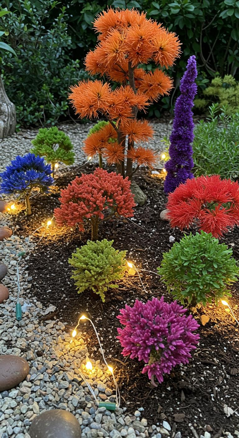 Place them along paths or among shrubs, secure with stakes, and enjoy a handcrafted, liberated display that’s easy to change.
