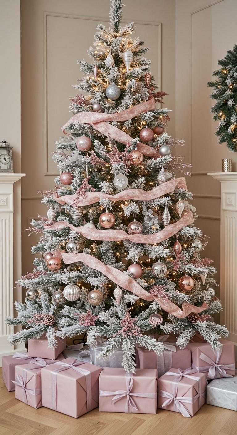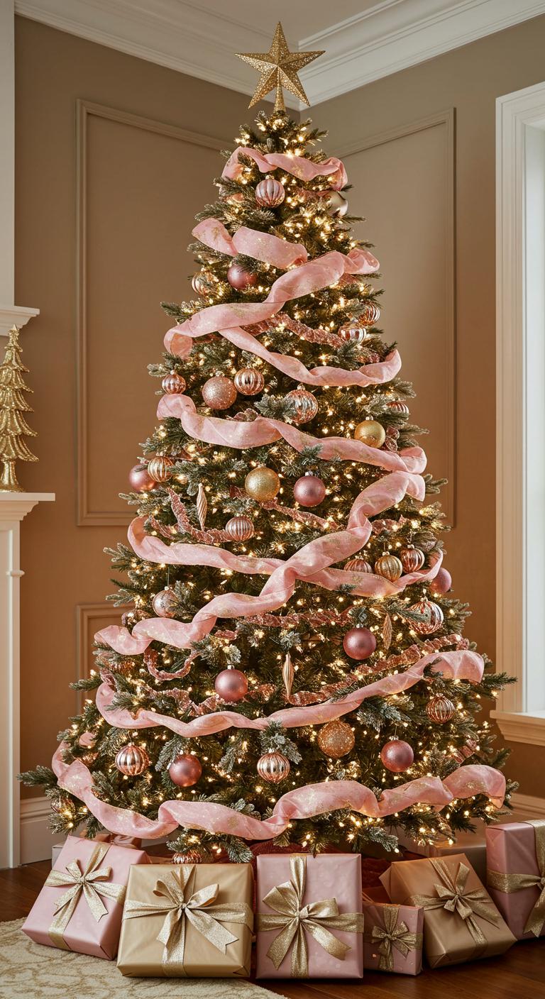 Adorn your tree with delicate blush ornaments, adding a gentle glow. Wrap rose gold ribbons around branches, enhancing the overall elegance.