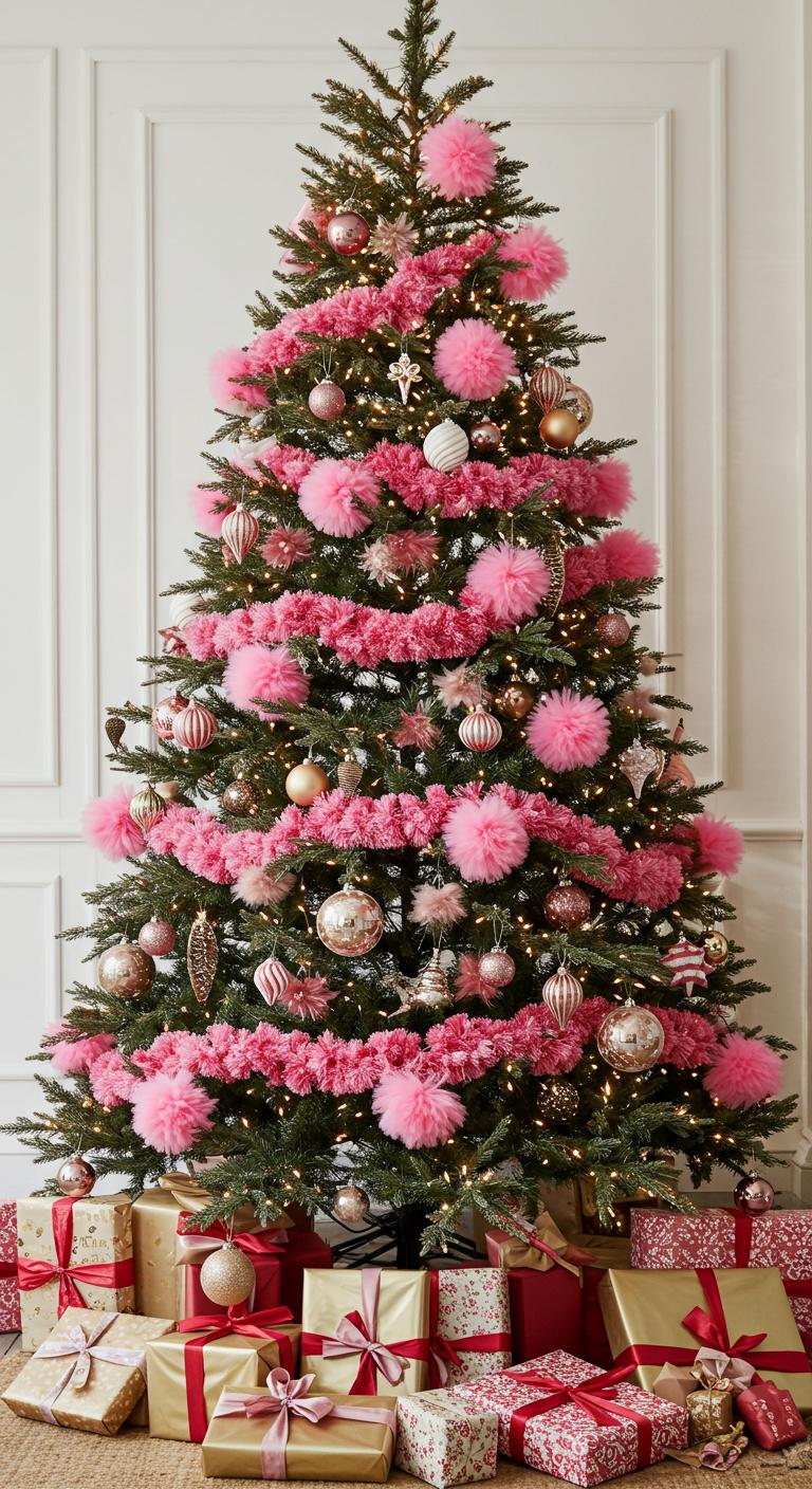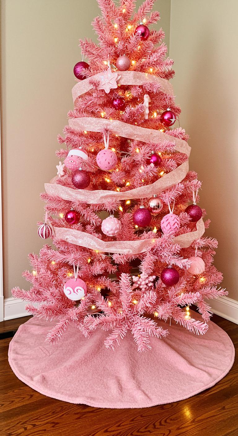 Imagine draping pink ribbon garlands gracefully around the branches, pairing them with cheerful ornament placements that pop with joy.