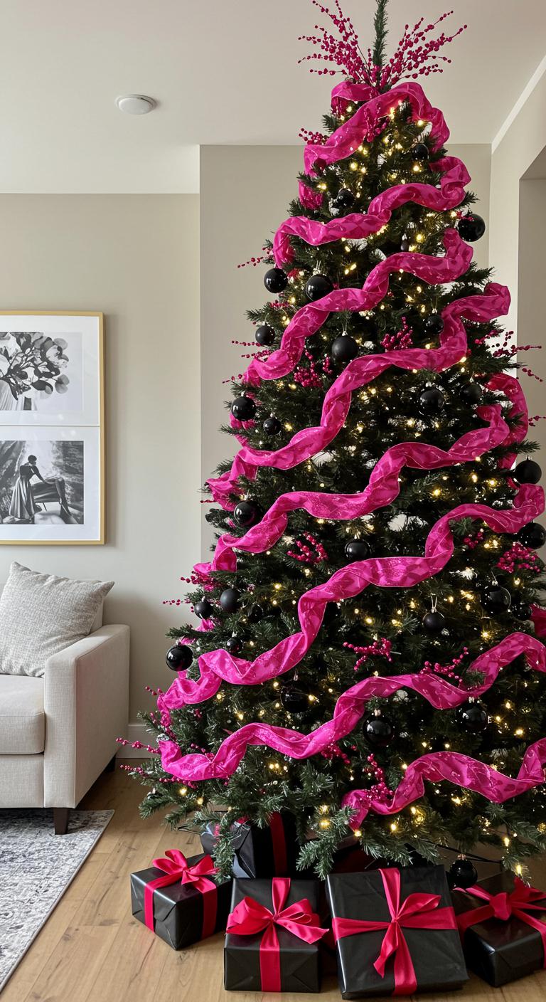 Picture your tree adorned with vibrant fuchsia ribbon accents cascading down, paired with eye-catching bold black ornaments.
