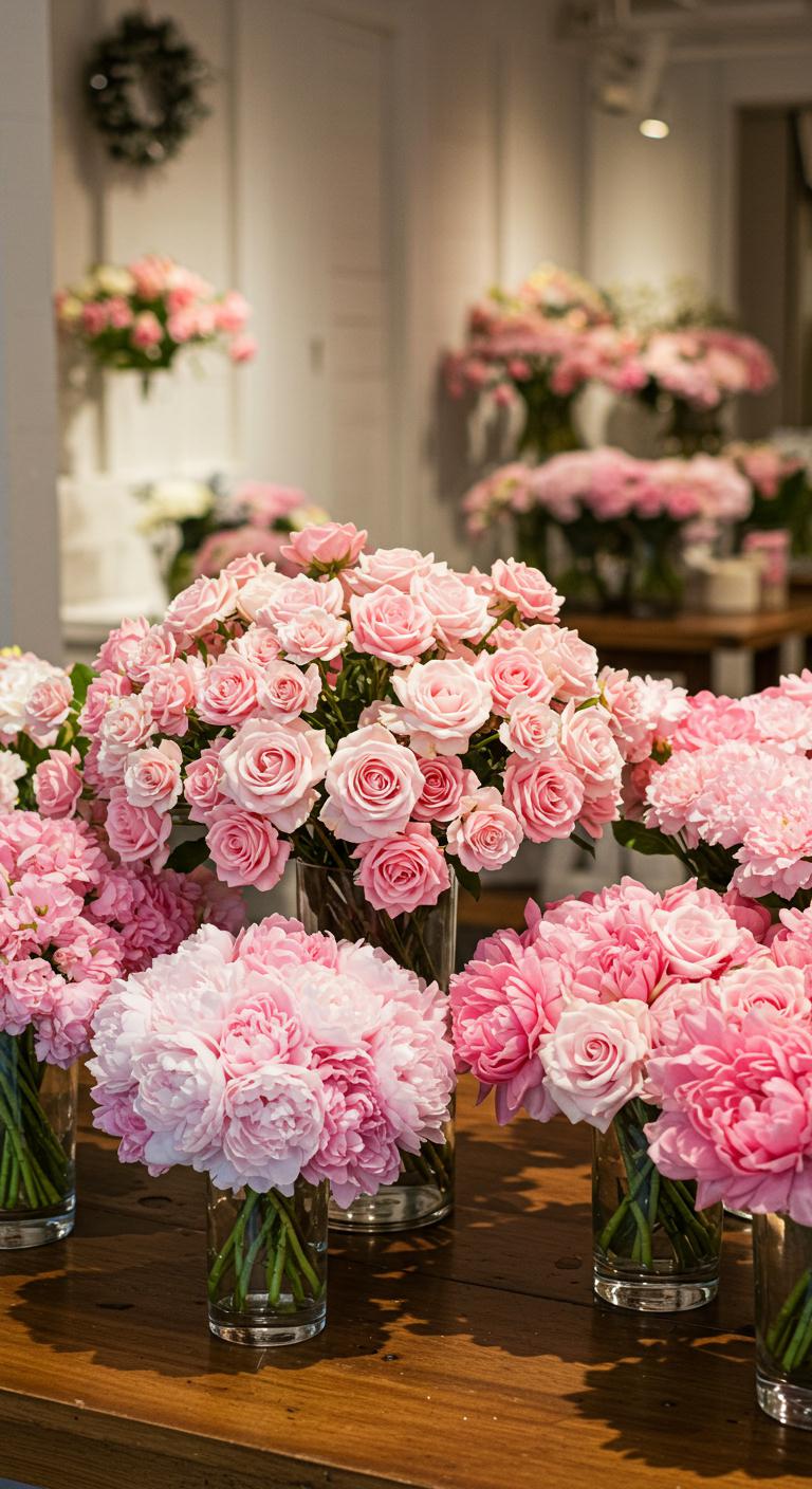 You can mix delicate pink blooms with pastel floral accents for a dreamy look. Placing these arrangements on tables or mantels creates a serene atmosphere that invites relaxation, making your space feel both festive and inviting.