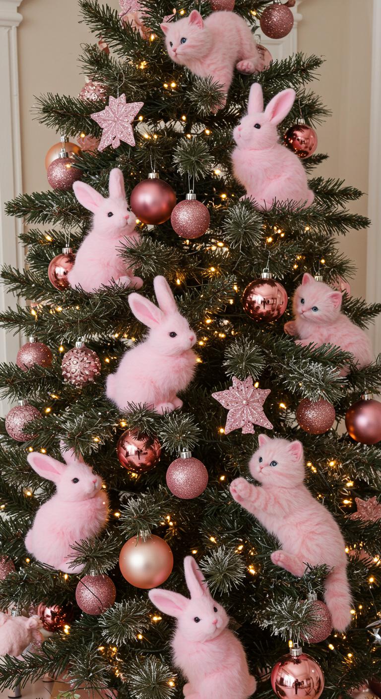 Adorn your Christmas tree with adorable pink animal ornaments that add a whimsical touch to your holiday decor.
