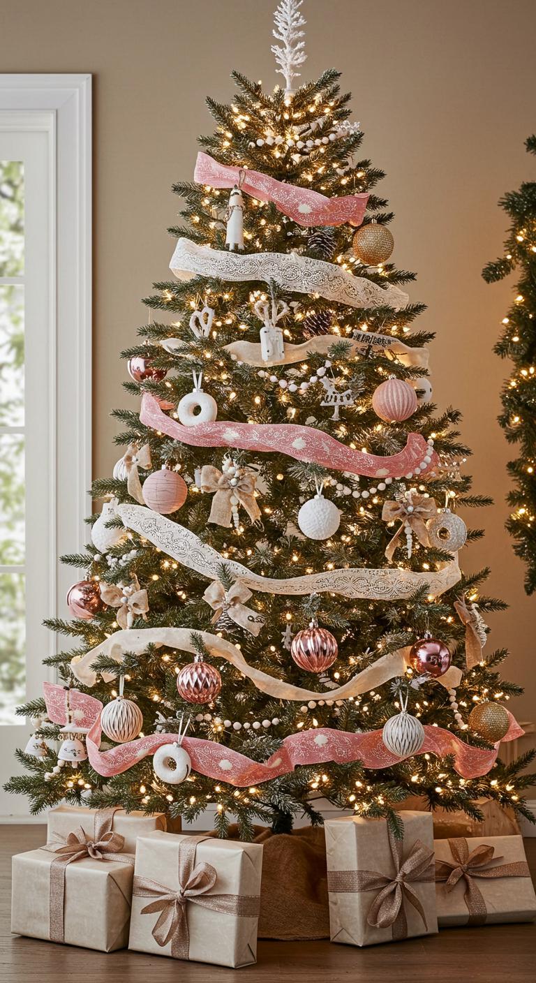 If you’re looking to blend rustic charm with a touch of elegance, consider embracing a pink and white decor theme for your Christmas tree.