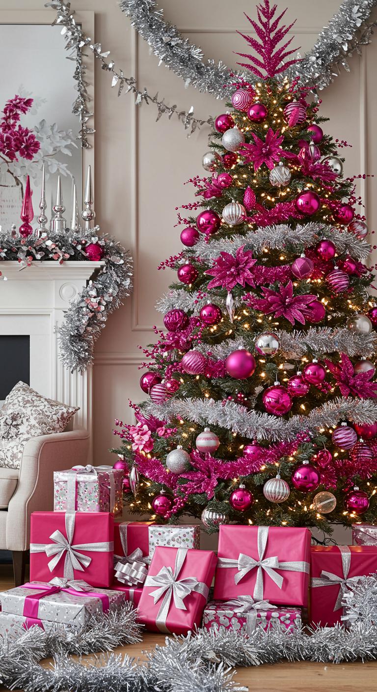 Transform your holiday decor with a glamorous hot pink and silver theme that radiates festive elegance.