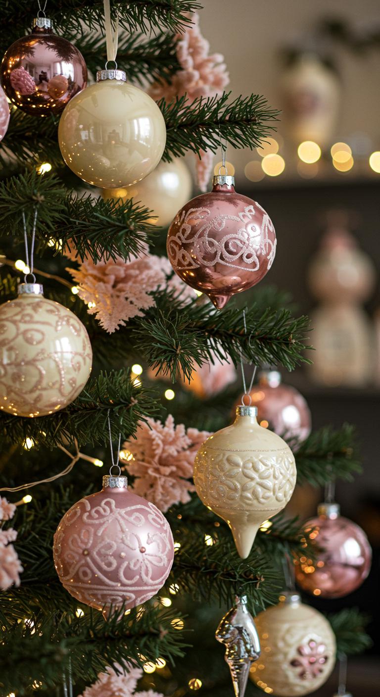 For a nostalgic touch that evokes holiday memories, vintage pink and cream ornaments are a charming addition to your Christmas tree decor.