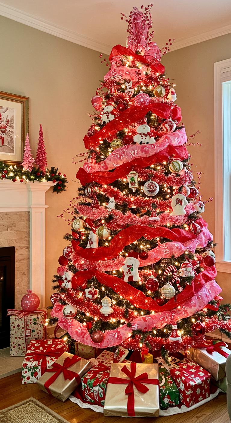 The cheerful combination of pink and red brings a vibrant energy to your Christmas tree decor that’s hard to resist.