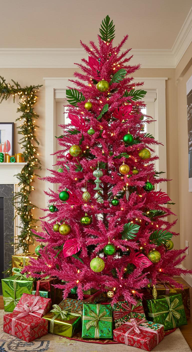 While you might think of traditional holiday colors, adding pink and green tropical vibes to your Christmas tree decor can transform your space into a vibrant oasis.