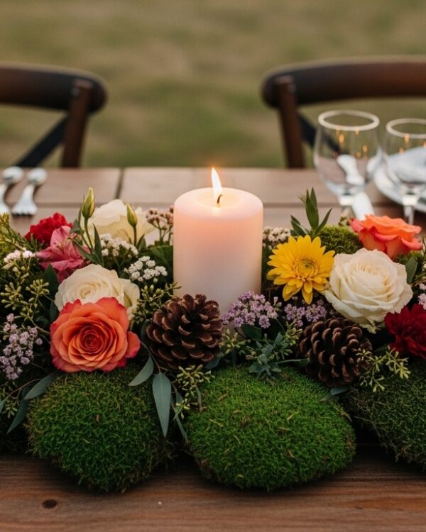 This moss-covered table with flickering candles screams backyard dream dinner. I love how the natural green runner ties it all together without feeling overdone. You could totally DIY this for your next BBQ – just grab some faux moss from the craft store.