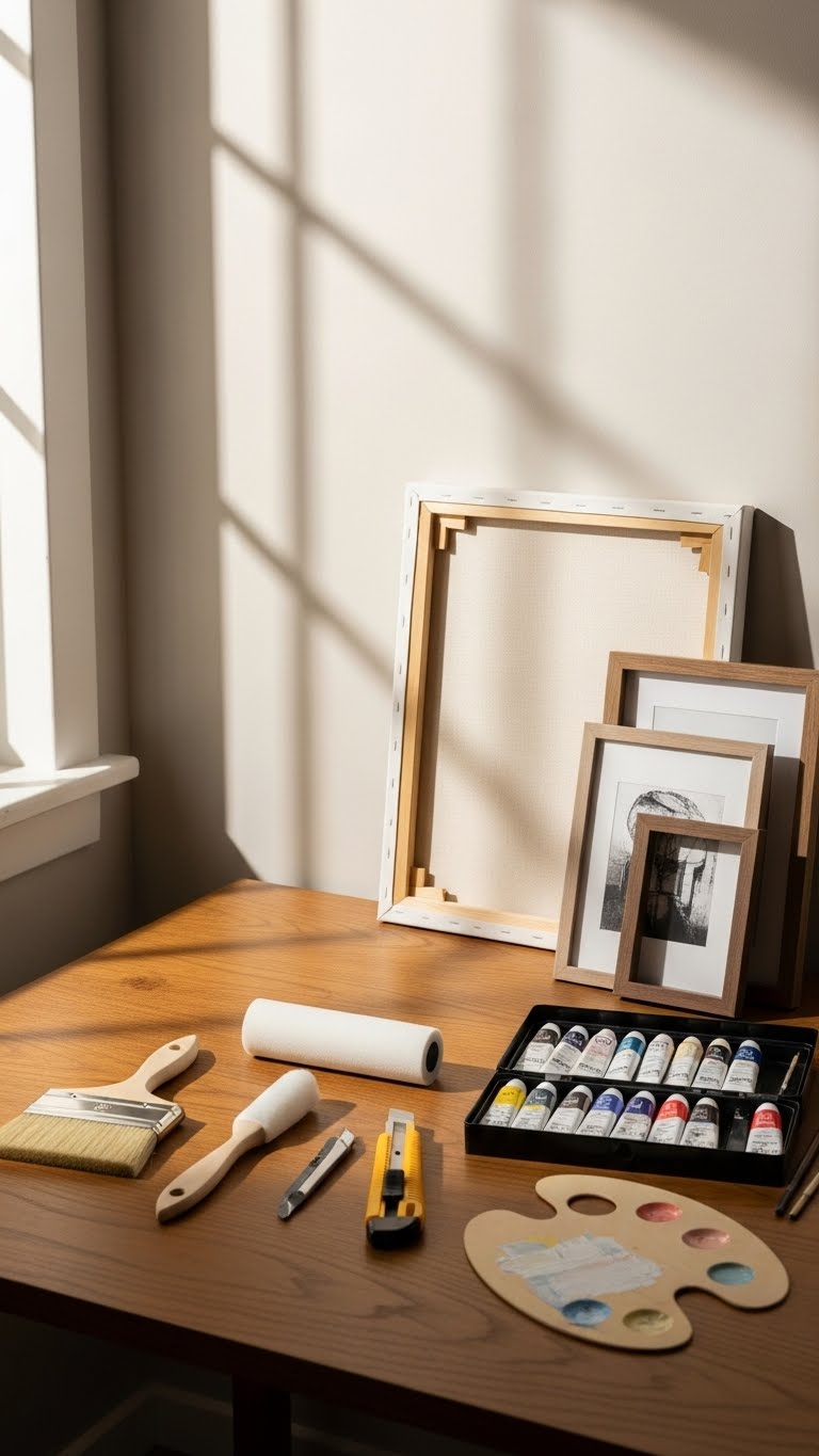 Before you jump in, map out a quick toolkit and timetable so your project looks intentional, not improvised: pick three versatile tools (a quality brush or foam roller, an acrylic set, and a sharp utility knife), set aside two focused sessions (one for creation, one for finishing and framing), and decide the final display size and format—canvas, framed print, or shadow box—so every decision from color mixing to edge treatment supports a gallery-ready result. Embrace a minimalist starter kit, sketch a tight timeline plan, trust instinct, and keep edits deliberate so your aesthetic stays liberated and modern.
