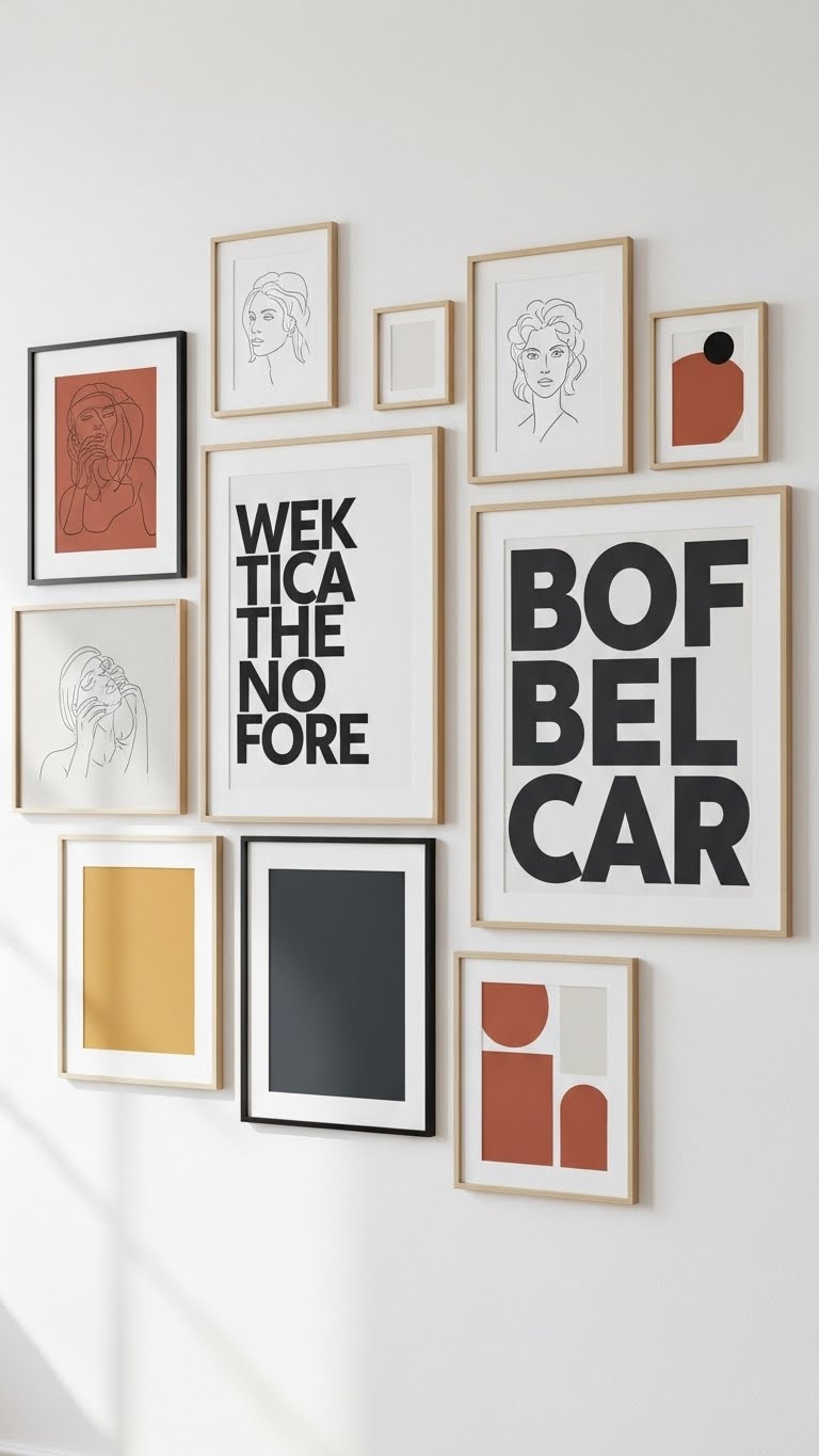 Plunge into a framed-print collage by curating downloadable art that speaks to your aesthetic—mix minimal line drawings, bold typographic pieces, and a few color-block prints to create contrast and cohesion.