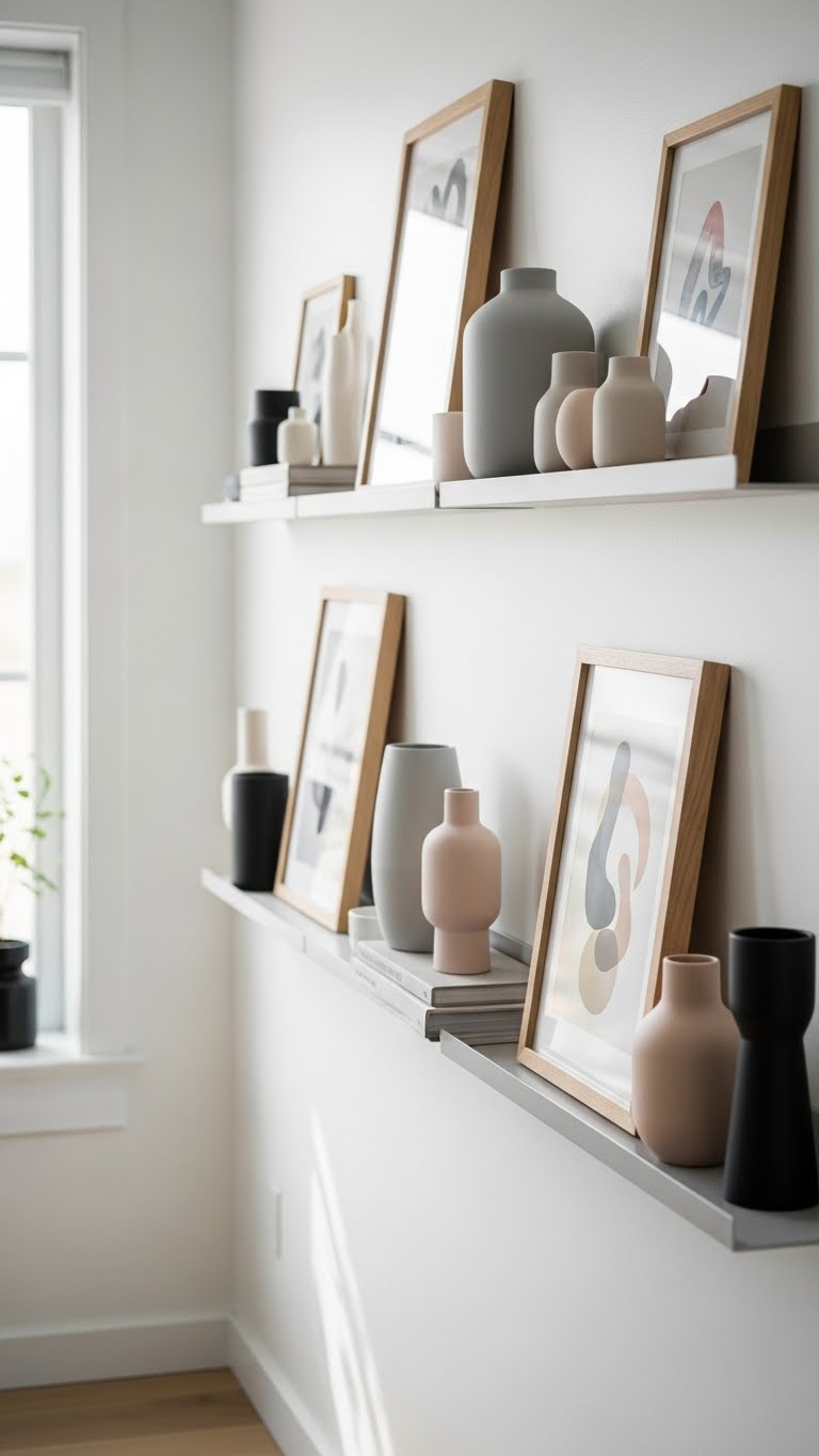 Layer in effortless change with a row of slim floating shelves that lets you swap art and objects without rehanging—just slide pieces in, rearrange, or rotate seasonally to keep the vignette fresh. You’ll mix framed prints, ceramics, and small sculptures on magnetic ledges for secure, fuss-free styling. Create bold, airy seasonal vignettes that let your space breathe and evolve.