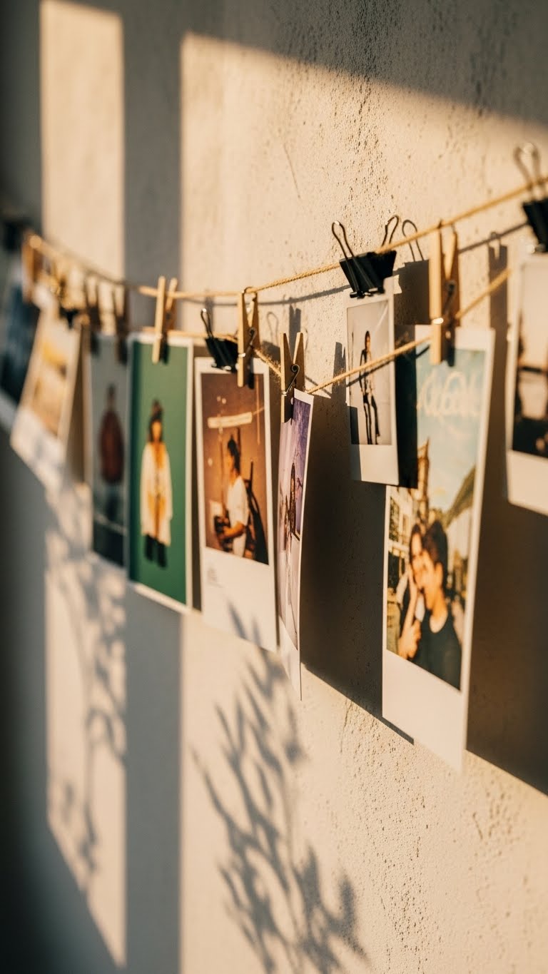 When you want gallery-style rotation without fuss, clip-and-string photo lines give you maximum flexibility with minimal fuss: a taut length of wire or twine anchored to the wall becomes a linear stage where prints, postcards, Polaroids and ephemera hang by clips, ready to swap, layer, or stagger into new compositions. You’ll curate rotating portfolios with clothespin themes, experiment with shadow play lighting, or add magnetic backings for quick shifts.