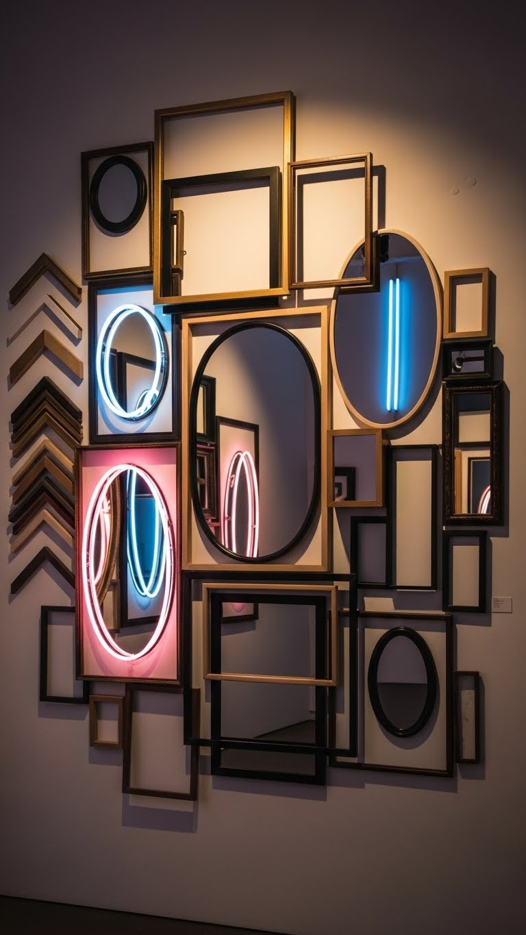 Layered Gallery With Mixed Frames, Mirrors, and Neon Accents