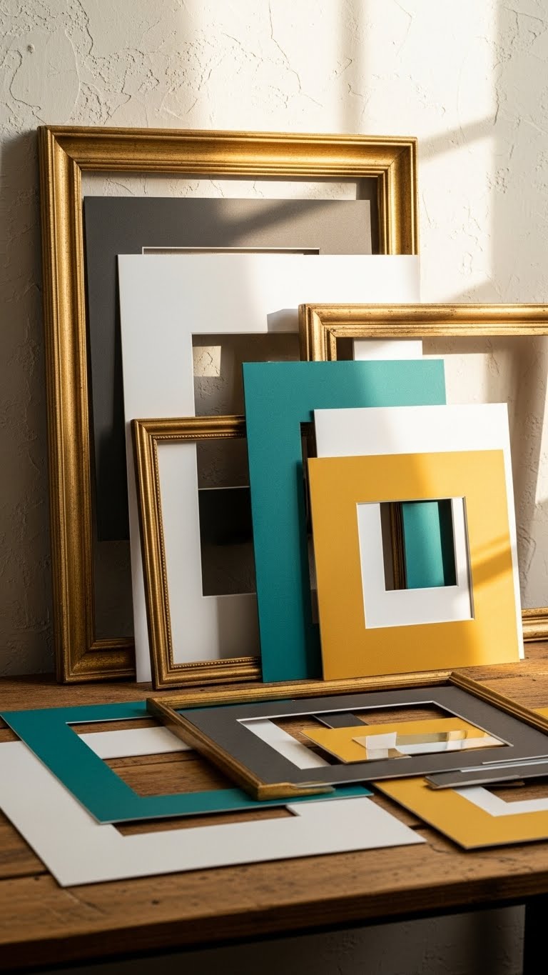 Give old frames new life by pairing their vintage charm with crisp, contemporary matting—you’ll get instant contrast that reads modern without erasing history.