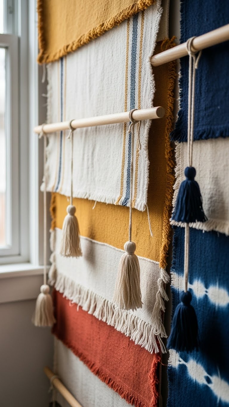 After working with plaster’s quiet relief, turn your attention to thrifted textiles to add warmth and tactile contrast on the same wall.