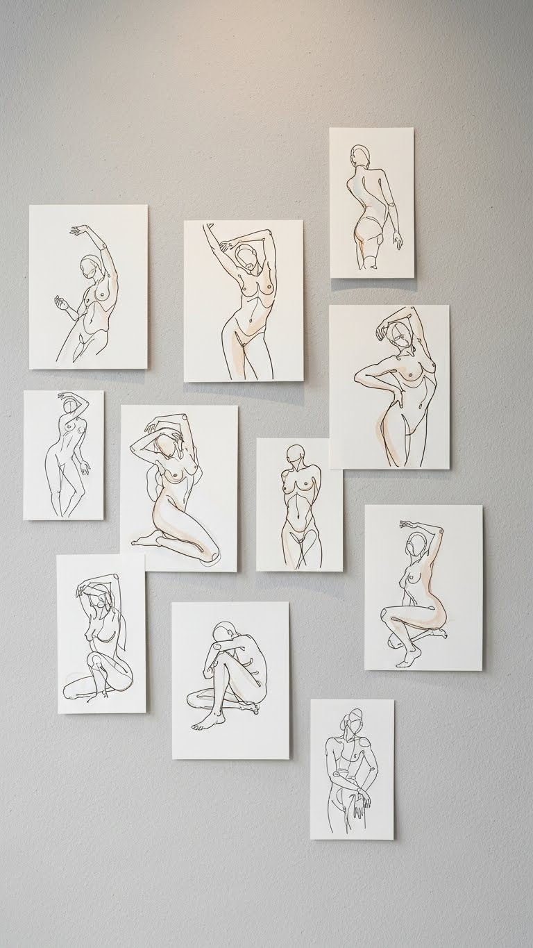 Though deceptively simple, single-line figure drawings let you capture posture, emotion, and movement with a continuous, confident stroke. You’ll embrace continuous contour techniques, tracing bodies in one fluid motion that celebrates spontaneity and restraint. Lean into negative space to define form, choose warm ink or graphite, and hang multiple small pieces for a liberated, gallery-ready set that feels modern and intentional.
