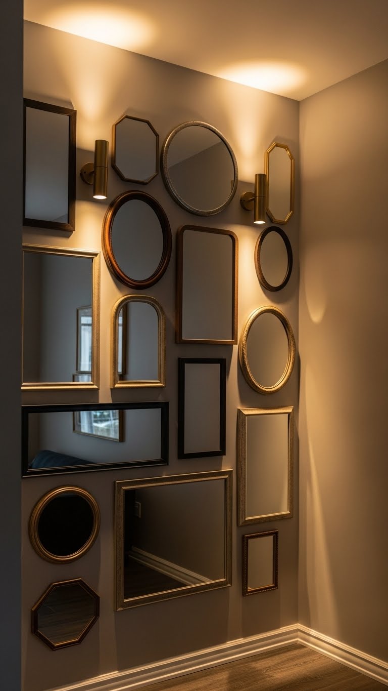 When you arrange a cluster of mismatched mirrors across a wall, you’ll instantly multiply light, depth, and personality in a small room.