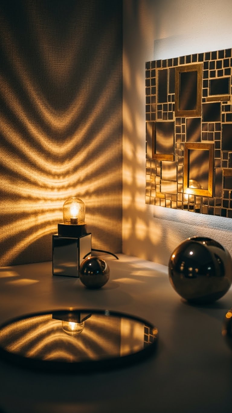 Because lighting and placement transform a mosaic from pretty to purposeful, plan your finish with intention: layer soft directional light to pick out mirror facets, tuck a warm accent lamp nearby to lift the brass tones, and use reflective companions sparingly so they echo rather than compete with the main piece.