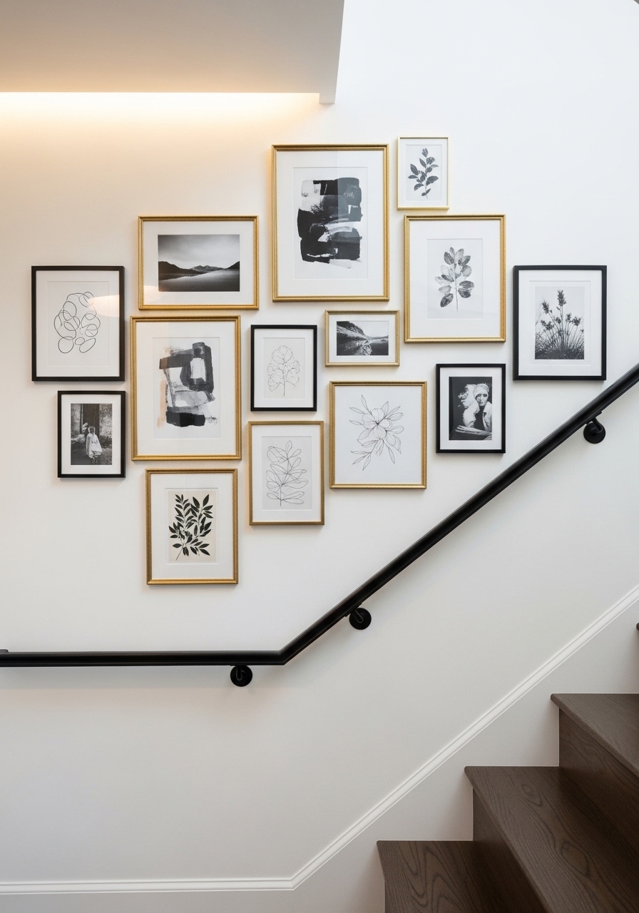 I thrift frames at Goodwill and add new white mats (11×14 white mats). The secret: pick one unifying element—same mat color or matching brass—and vary the frames. Use kraft paper templates to plan. Common mistake: spacing them evenly like a grid. Intentional irregularity reads curated.