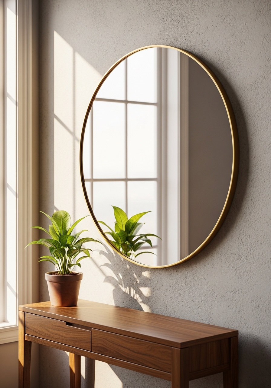 A large mirror reflects daylight and doubles visual space. I used a 36-inch round mirror and placed it opposite a window. Mirrors work best when slightly angled. Don’t hang tiny mirrors and expect the same impact—go big or lean.