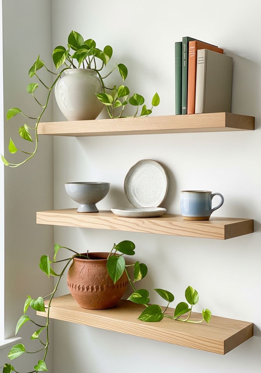 - White oak beats dark wood in 2025: Try white oak floating shelves.