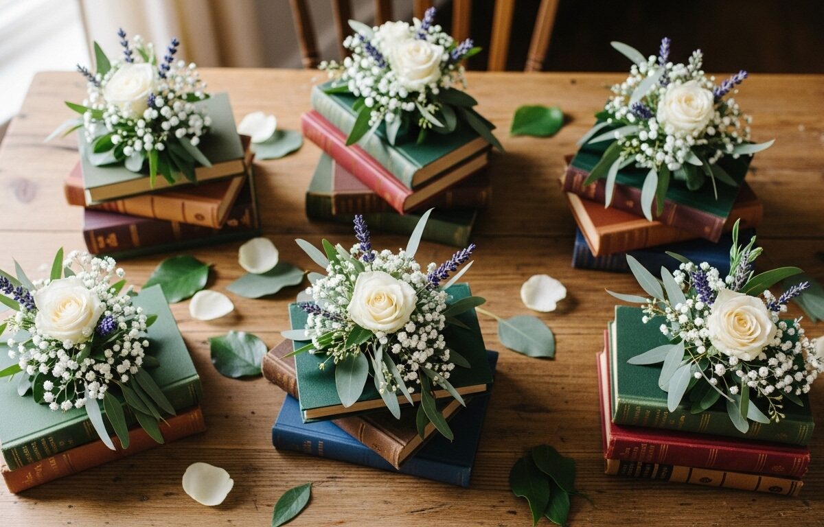 Open books draped in flowers and vines – boho bookworm heaven. I wove in some eucalyptus from the store and it lasted days; low-maintenance luxury. Your guests will beg for the how-to.