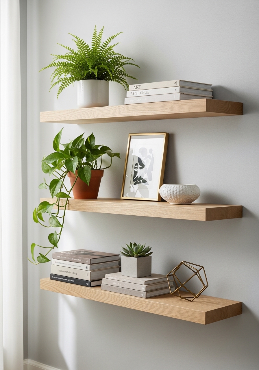 - White oak is trending in 2025: Try white oak floating shelves for a fresh look.