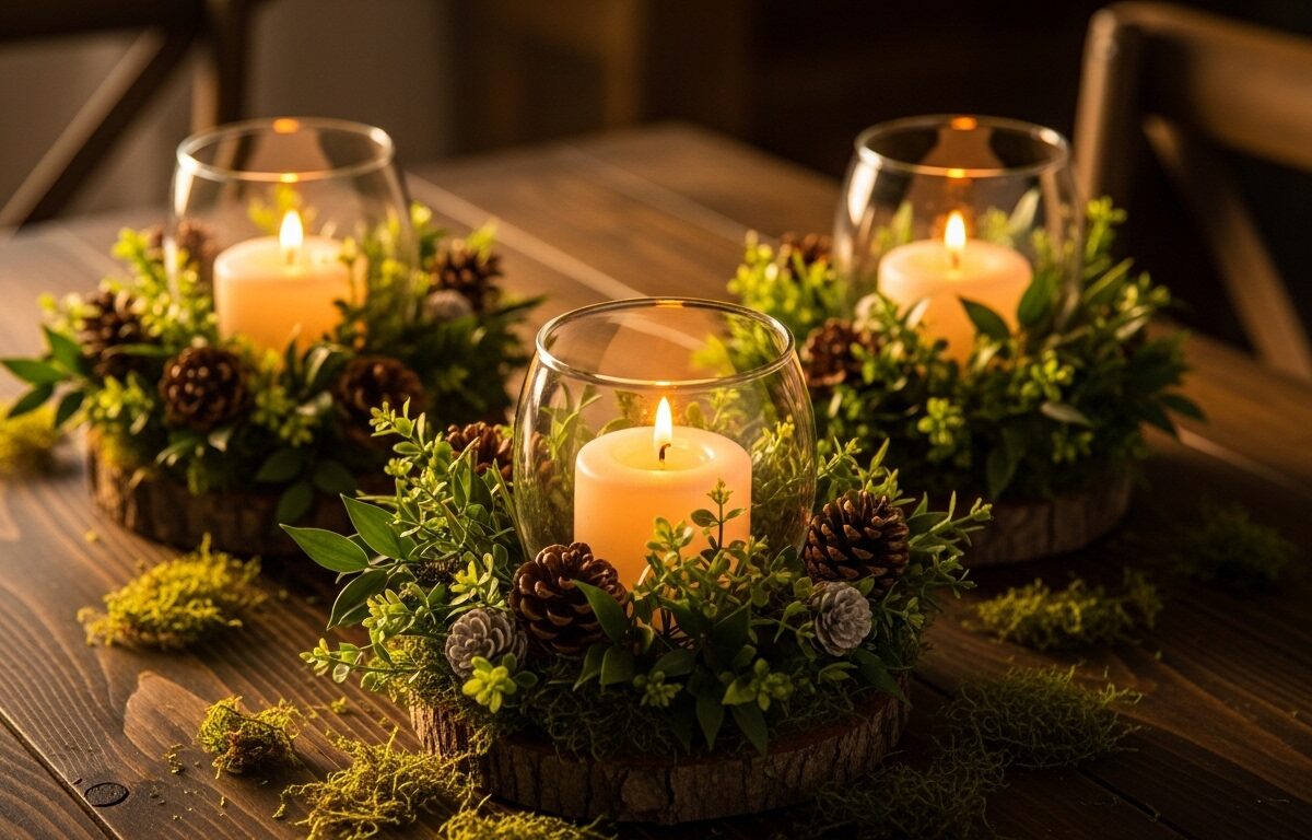 Glass vases topped and bottomed with fresh greenery around candles – fall vibes on point. You can snag clippings from your yard or market greens cheap. Made one last autumn; guests thought I was a pro florist, ha.