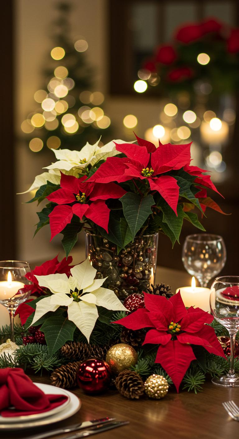 As you gather your materials for a festive touch, consider the classic red and white poinsettia arrangement that instantly brings warmth and cheer to your holiday decor.