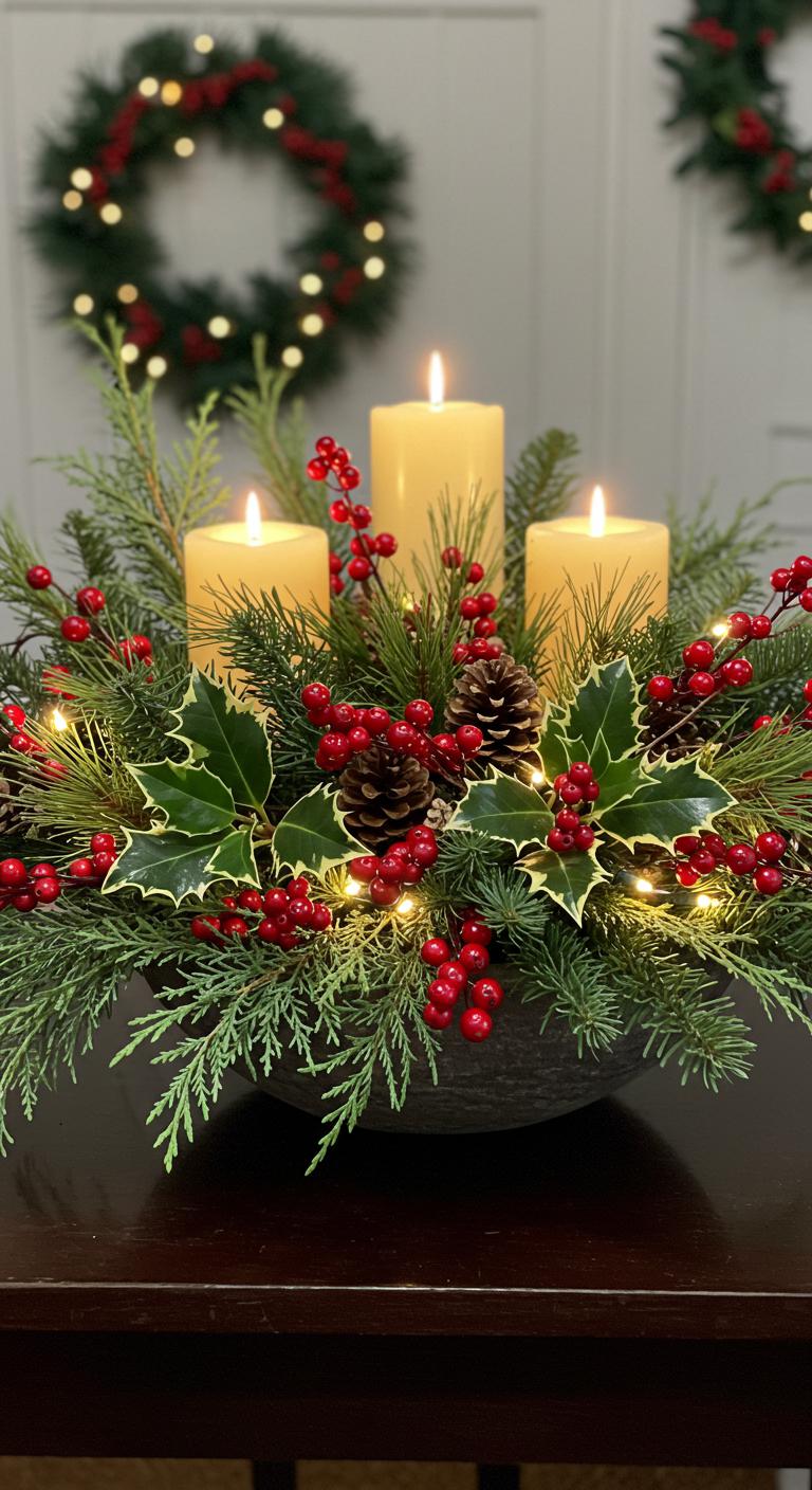 Create a stunning evergreen and berry centerpiece that captures the essence of the holiday season in just a few simple steps. Combine rich evergreen textures like fir and cedar with vibrant berry varieties such as holly and cranberries. Arrange them in a rustic bowl, adding twinkling lights or candles for warmth. This centerpiece will infuse your space with festive cheer and natural beauty.