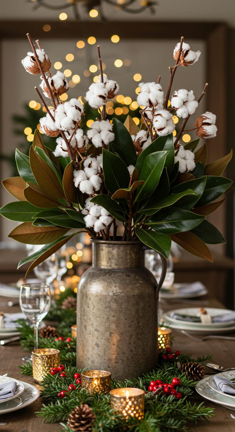 Arrange cotton bolls and lush magnolia leaves in a rustic vase, and watch your table transform into a cozy, festive haven.