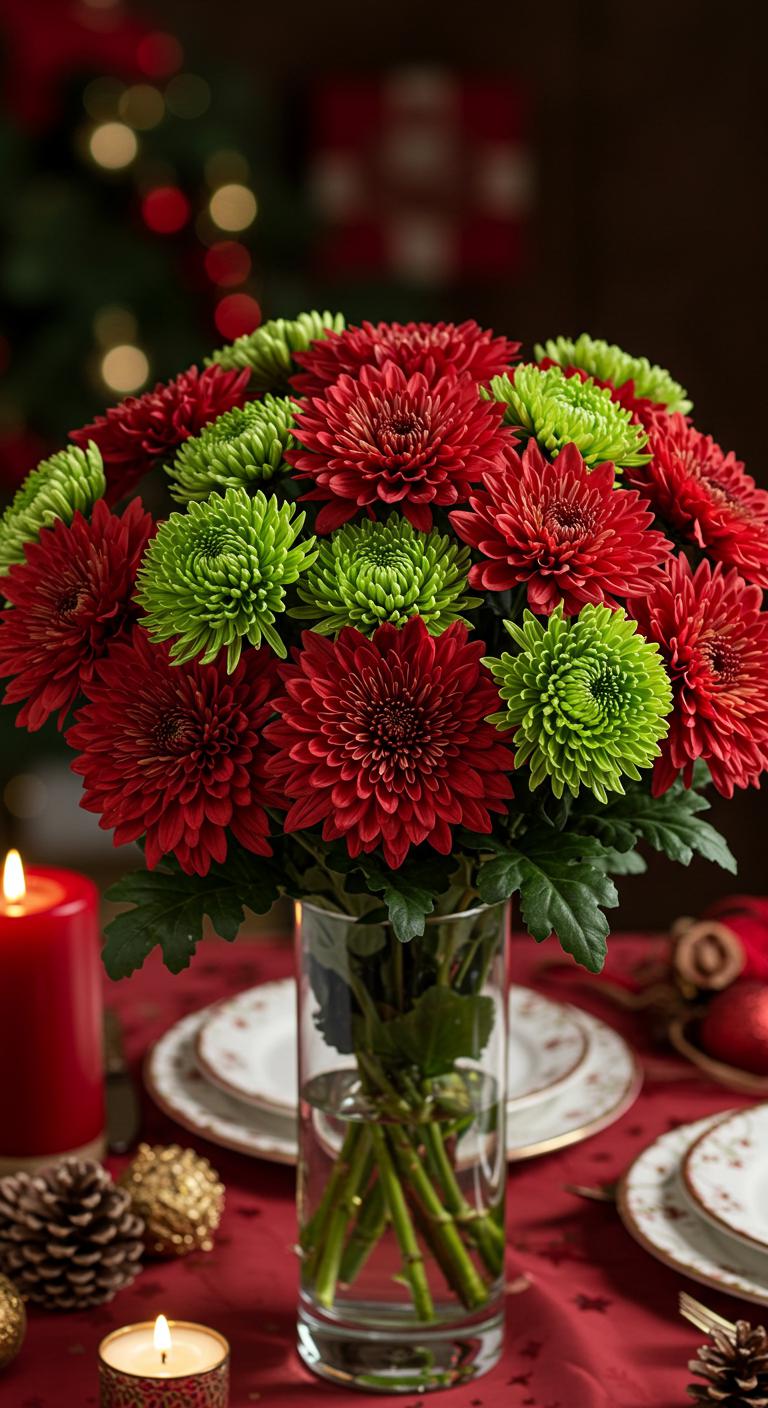Adding a charming red and green chrysanthemum bouquet to your holiday decor can create a striking visual that perfectly complements the festive atmosphere.