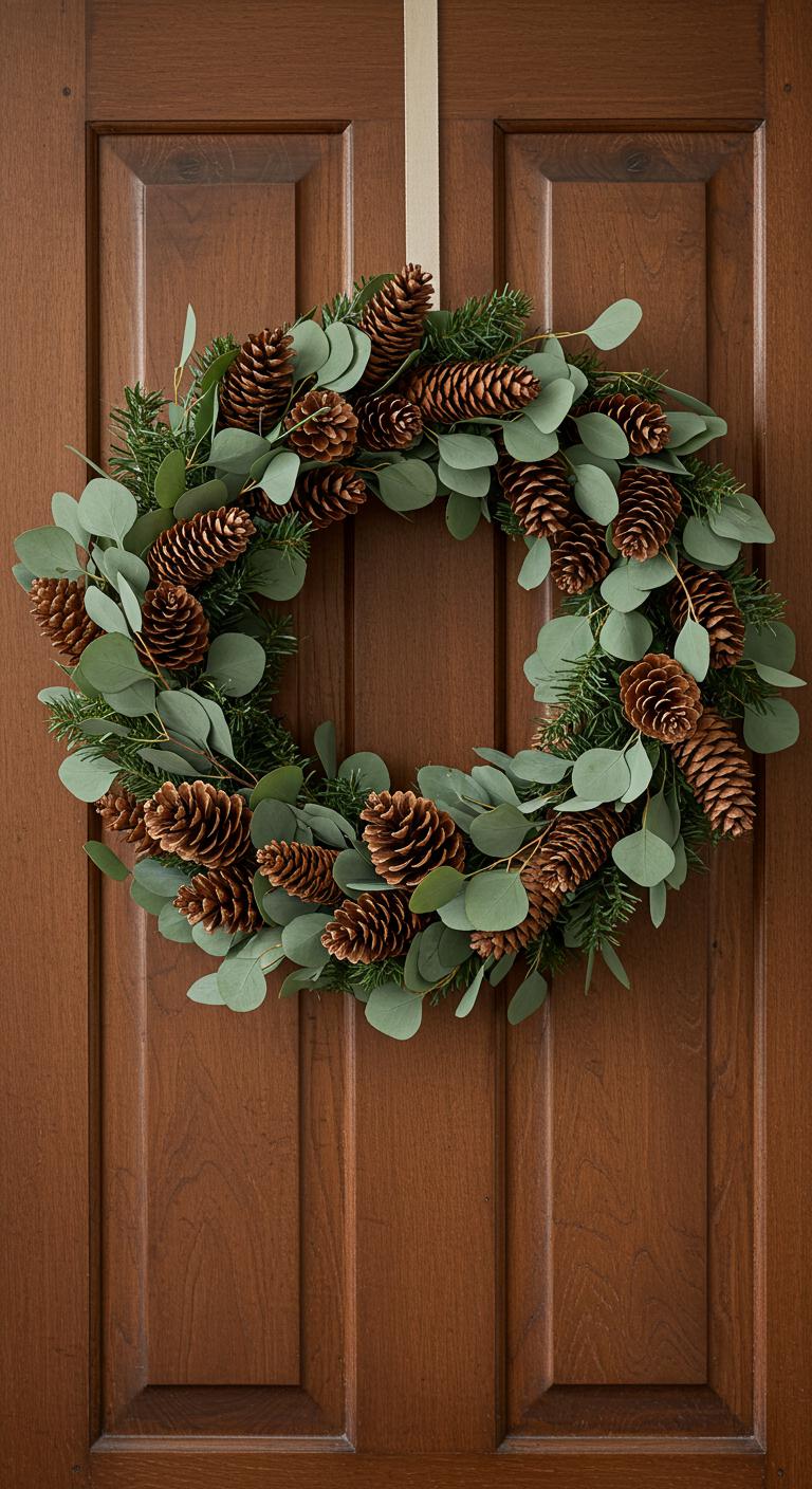 A rustic pinecone and eucalyptus wreath brings an earthy elegance to your holiday decor.