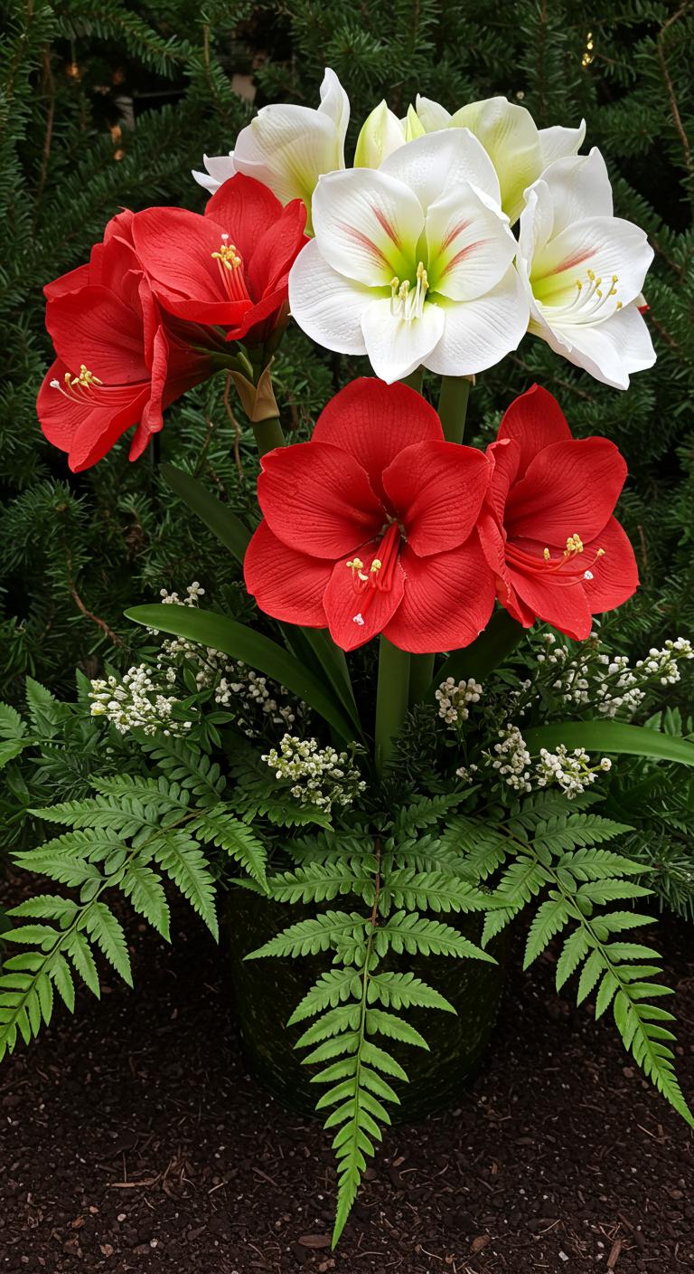 Transform your holiday decor with a vibrant amaryllis and fern bouquet that bursts with color and life.